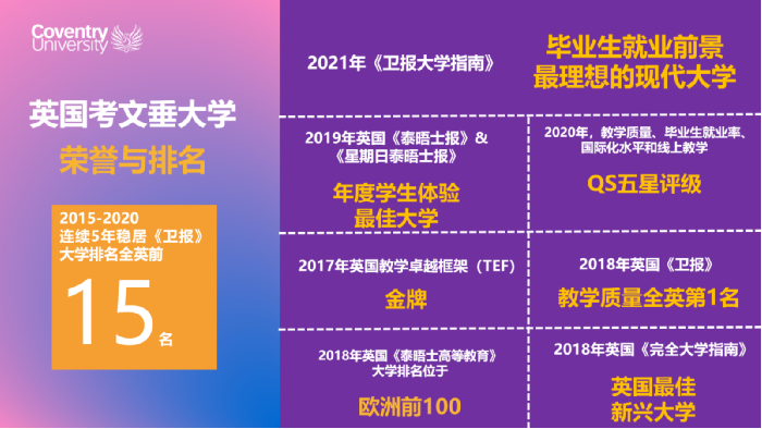 一直以来,考文垂大学凭借其创新式教学模式及雄厚的学术研究实力,获得广泛的影响力并且赢得全球性的声誉;在学生体验方面,考文垂大学注重培养学生国际视野,提供丰富实用的课外实践活动。我们的职业指导团队(Talent Team)将为学生提供英国和国际实习就业方面的建议与指导, 在撰写简历和工作申请流程方面给予支持。
