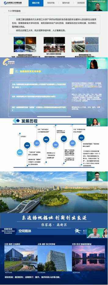 随着新时代人才强国战略的深入实施,国内的人才政策和创新创业环境不断完善优化。本次活动特别邀请了北京理工留学人员创业园副主任董倩倩、成都留学人员创业园王镱霖、内蒙古自治区留学人员创业园服务中心负责人王晓婷、张家港市高新区创新发展部人才科科长曾钰和长三角国家技术创新中心海外合作部业务经理姜南、段然介绍了北京、成都、内蒙古自治区、张家港和长三角等地的发展环境和创新创业政策。